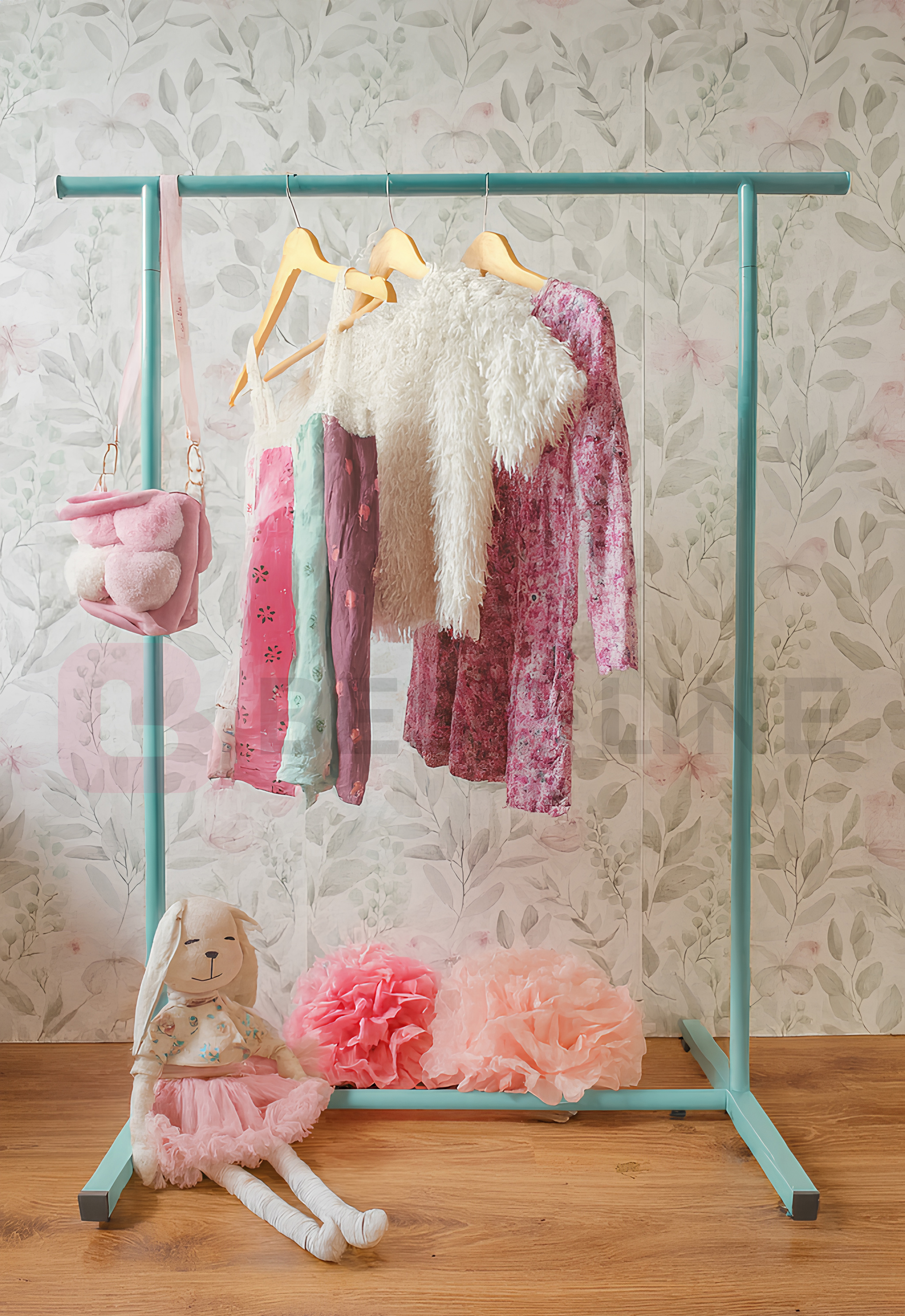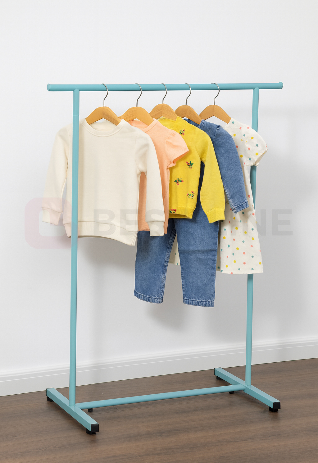 Zastosowanie niebieskiego koloru nadaje stojakowi lekkości, radosnego charakteru i doskonale wpisuje się w dziecięce aranżacje wnętrz. Dzięki swojej konstrukcji nawiązuje do nowoczesnego stylu loftowego, zachowując przy tym prostotę i trwałość. Wieszak w tym rozmiarze pozwala uporządkować codzienną garderobę dziecka – kurtki, sukienki, swetry czy bluzki – sprawiając, że wszystko ma swoje miejsce i jest łatwo dostępne.