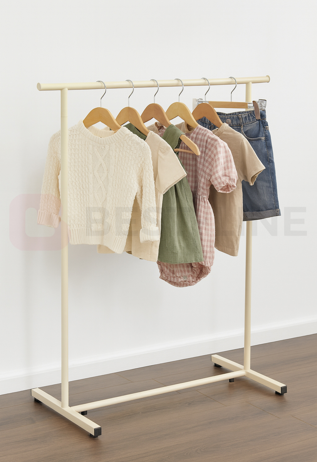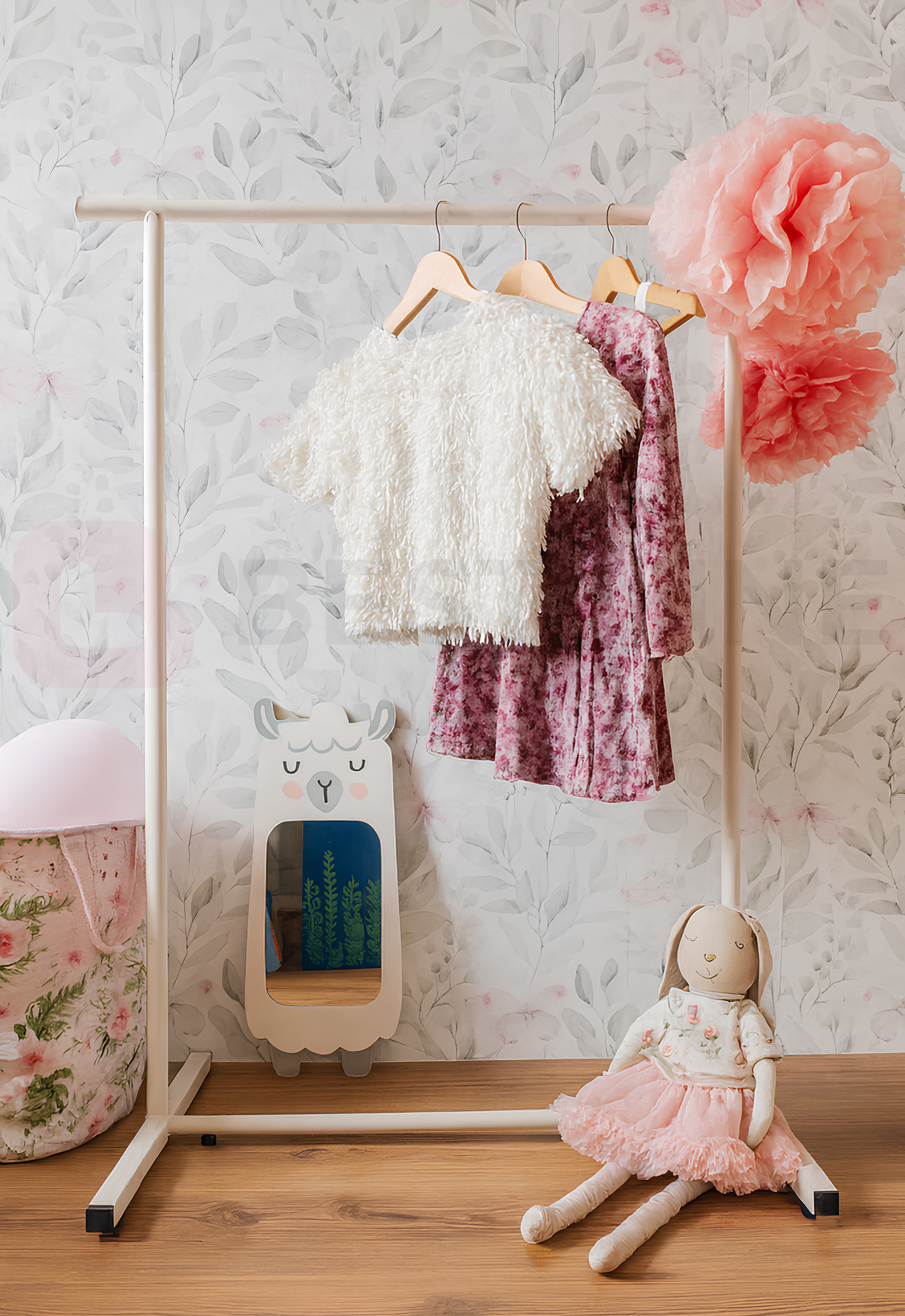 Zastosowanie koloru ecru nadaje stojakowi lekkości, radosnego charakteru i doskonale wpisuje się w dziecięce aranżacje wnętrz. Dzięki swojej konstrukcji nawiązuje do nowoczesnego stylu loftowego, zachowując przy tym prostotę i trwałość. Wieszak w tym rozmiarze pozwala uporządkować codzienną garderobę dziecka – kurtki, sukienki, swetry czy bluzki – sprawiając, że wszystko ma swoje miejsce i jest łatwo dostępne.