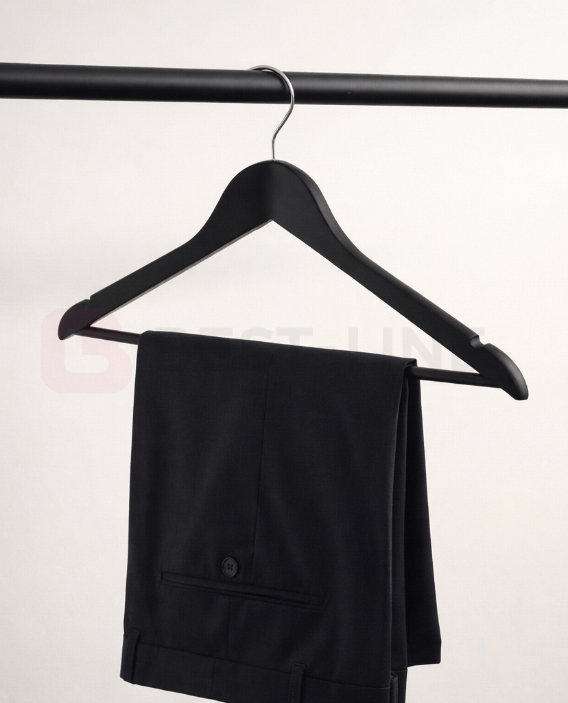 Drewniana, zaokrąglona poprzeczka dodatkowo wzmacnia konstrukcję wieszaka, zwiększając jego trwałość i umożliwiając bezpieczne zawieszanie spodni lub spódnic.