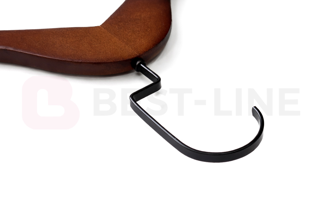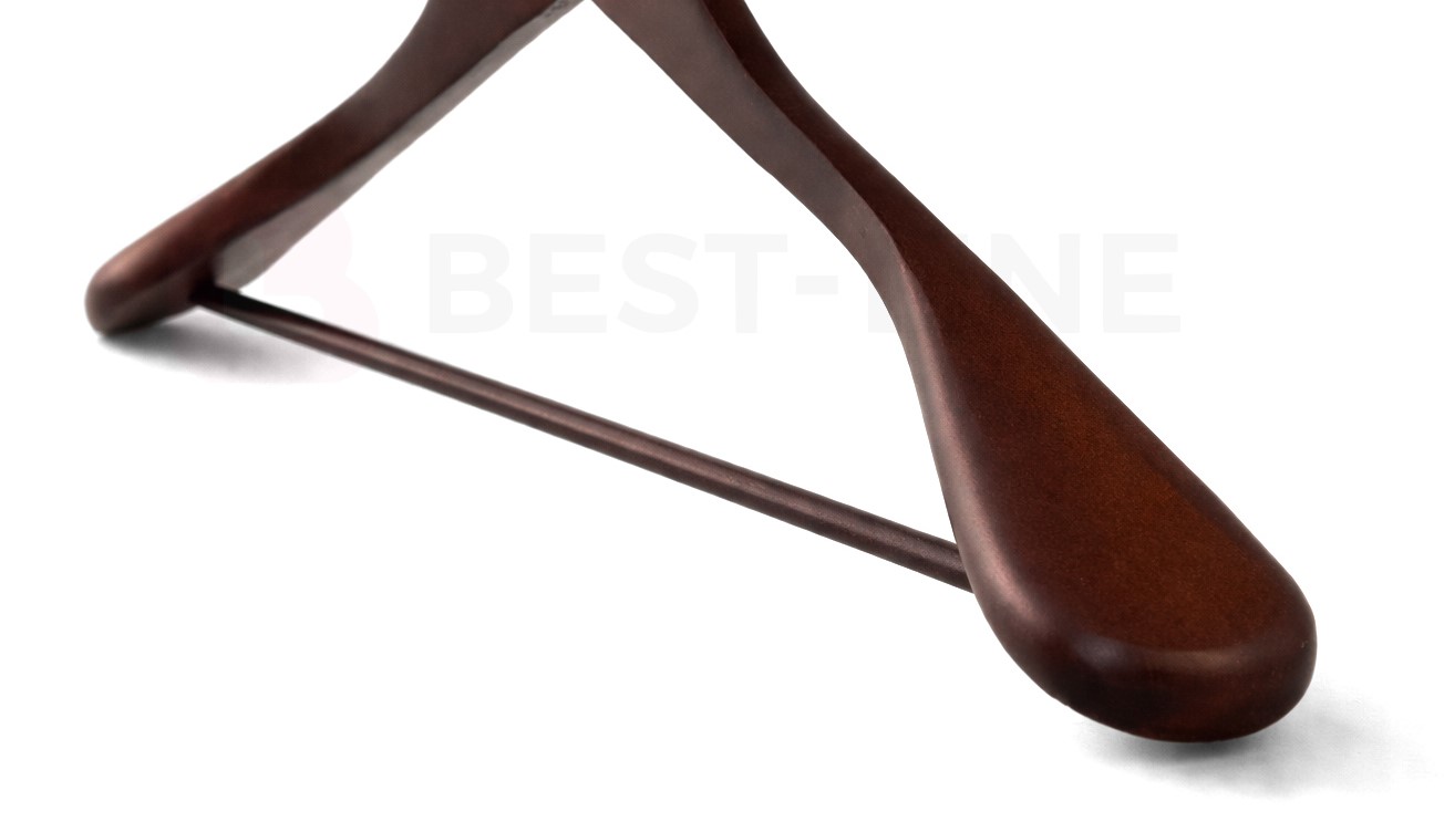 Opis: Elegancki, klasyczny i wytrzymały wieszak z poprzeczką, wykonany z naturalnego drewna zabezpieczonego lakierem w kolorze ciemnego brązu.