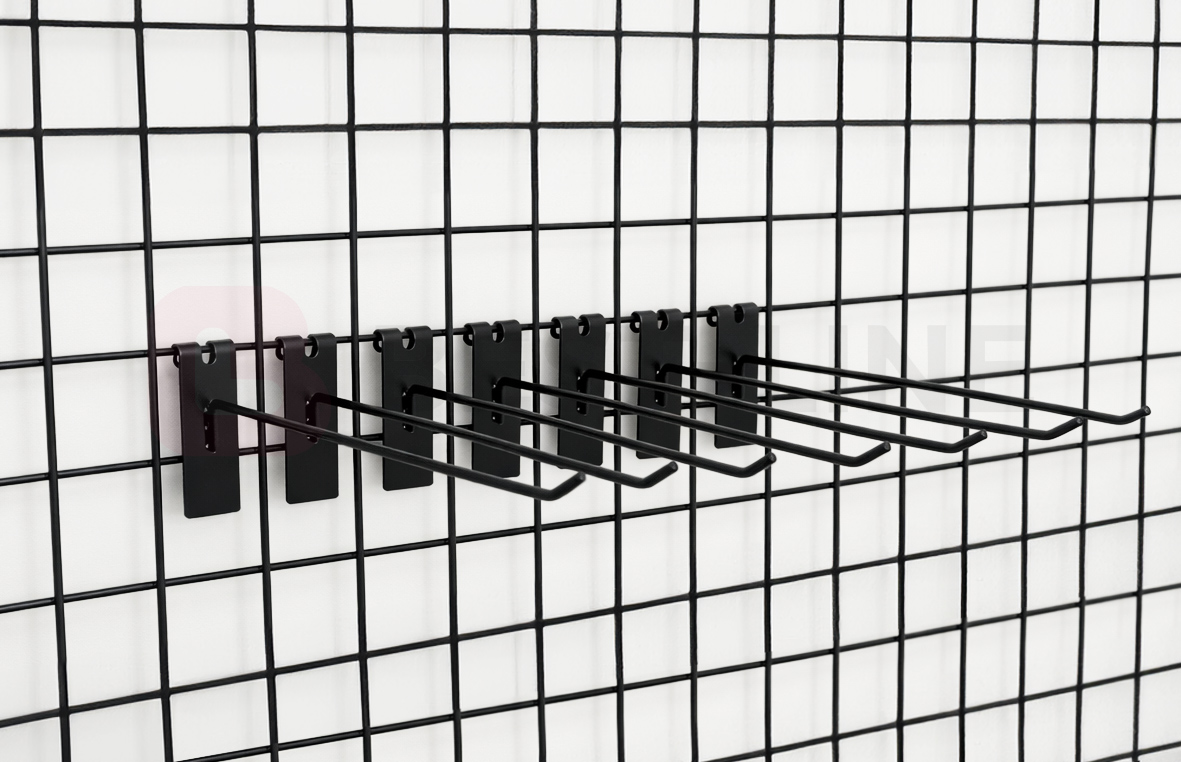Opis: Solidna zawieszka pojedyncza w kolorze czarnym, wykonana z grubego drutu o średnicy 4 mm, przeznaczona do łatwego montażu na kracie o oczku 5×5cm.